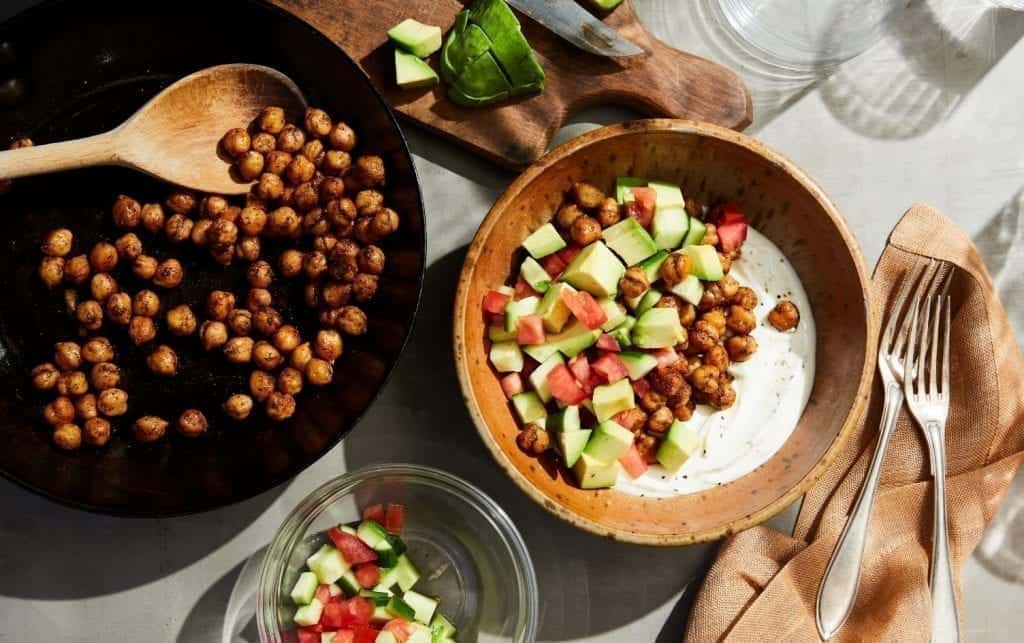 Robust spices toasted with canned chickpeas form the anchor of this quick lunch. The spiced chickpeas are piled onto a bed of lemony, salted yogurt, along with tomato, cucumber and avocado. The result is a filling vegetarian meal packed with fiber.